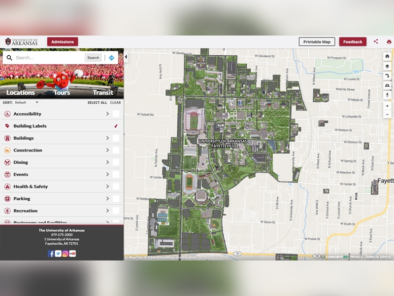 The official University of Arkansas campus map is more interactive than ever before. The new map has added a number of features to make it easier to navigate campus whether you are a new student, a returning alumnus, or just visiting for the next Razorback sporting event.