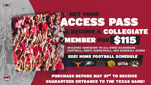 As the school year comes to a close, don't forget to purchase your Access Pass for next year! For $115, you can become an Access Pass holder and a Razorback Foundation Collegiate Member. By becoming an Access Pass holder, you will be eligible to request tickets to football, men's basketball and baseball games, in addition to attending all other Razorback home sporting events.